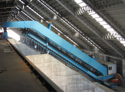 半門式取料機多與天車堆料機配合,料倉中間布置隔墻,成對布置。